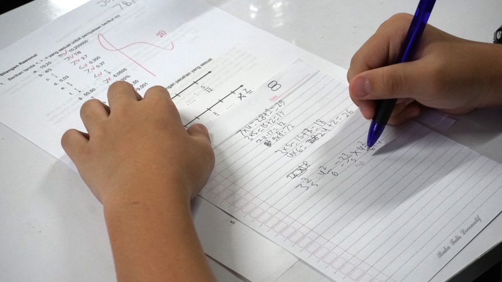 Wajah mereka serius. Dahi pun berkerut. Beberapa wajah tampak semakin mendekat dengan lembaran kertas di atas meja. Isi lembaran kertas yang sedang dikerjakan adalah beberapa soal matematika.